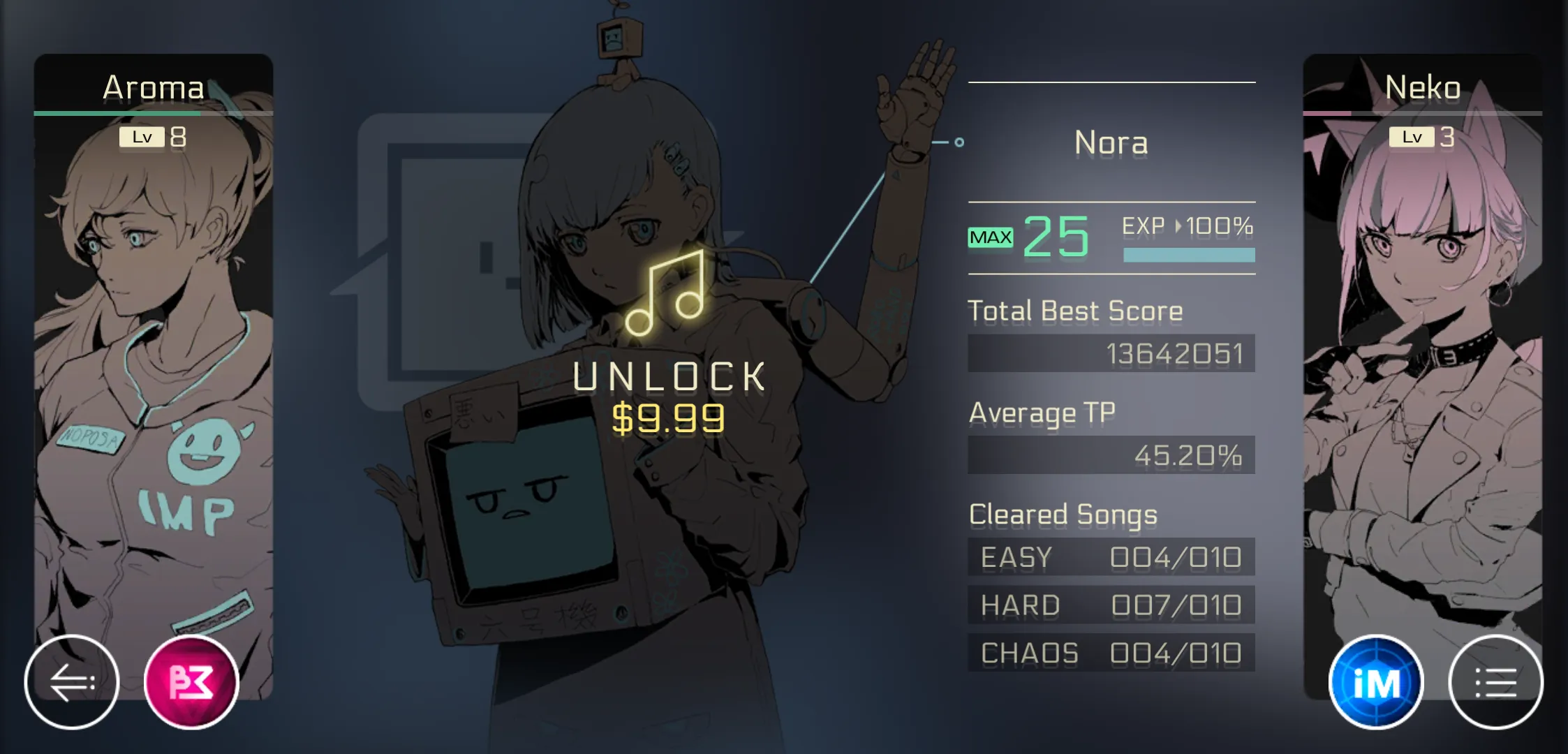 Im或者设置圆按钮进入Im或者设置,再返回(只有右侧按钮可以成功响应),即可跳过强退游戏的步骤强退游戏,再次内购上一步操作中尝试内购的商品。弹出破解应用内购菜单,不要点是,直接点击对话框外任意部分即可,至此内购完成。其余角色,曲包等都可通过相同方法购买。注意:在重新启动游戏后,之前内购成功的商品会丢失。因此在每次进行游戏前都需要重复步骤三。