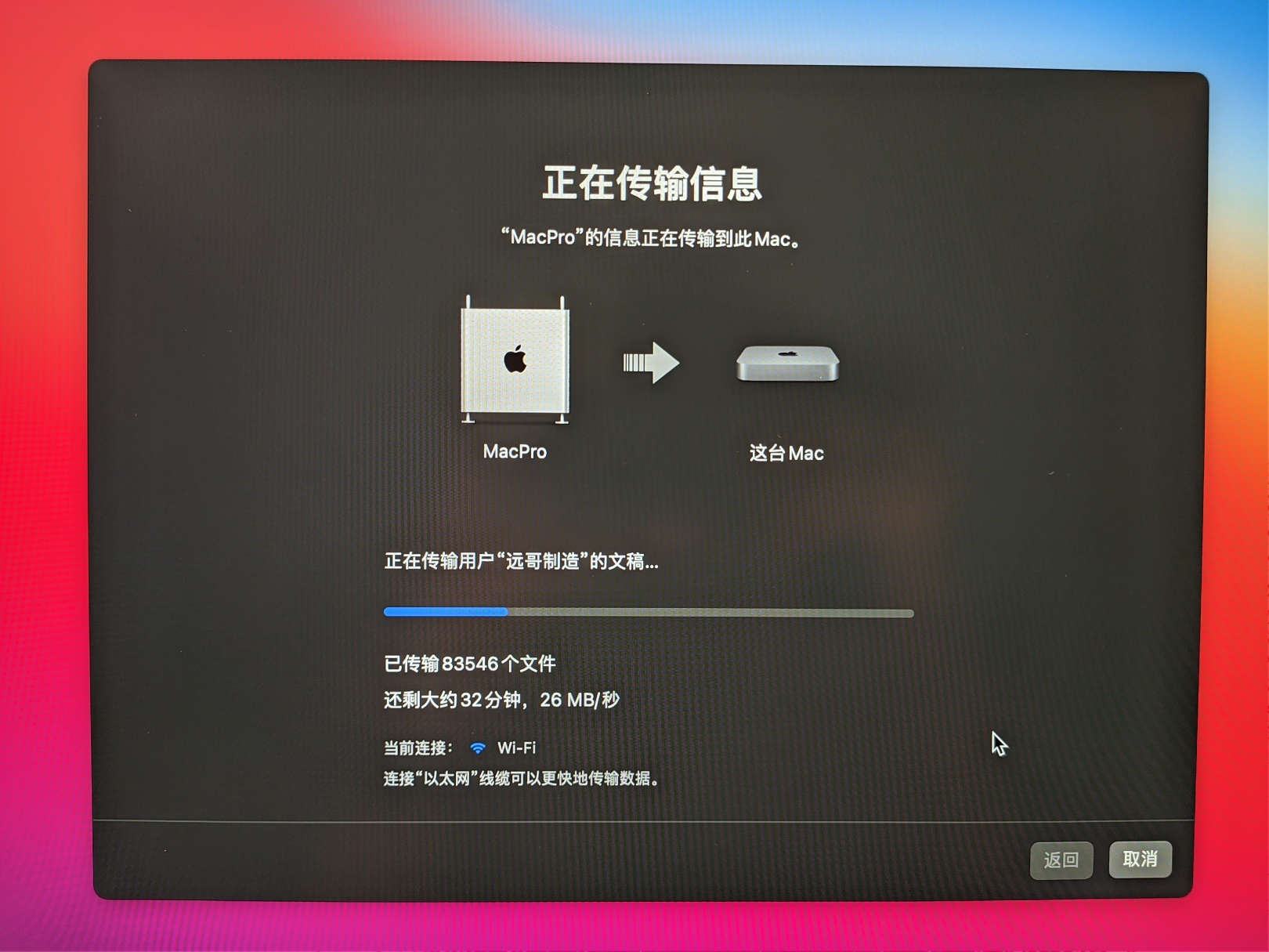 配置完成之后,看着空空如也的桌面,实在是懒得手动数据迁移,尝试自带应用迁移助手,新旧电脑都进入此app之后开始传输,黑苹果插着网线,mini连着WiFi,二三十兆的传输速度