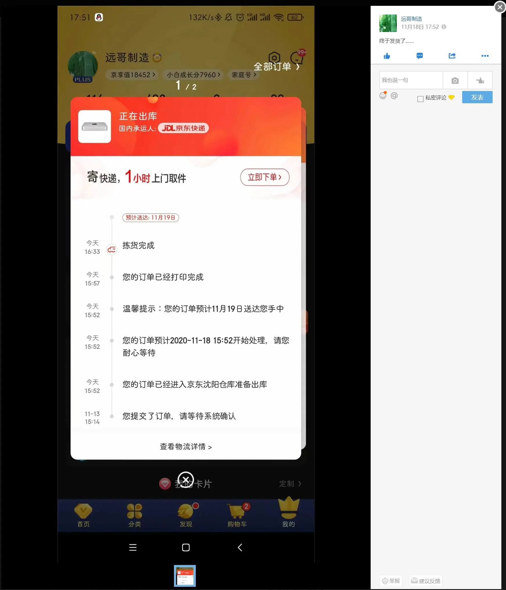然后真就2000 years later……,前一天的状态变成了预计最早19日后发货草……非常搞笑,狗东竟然更改了配送时效