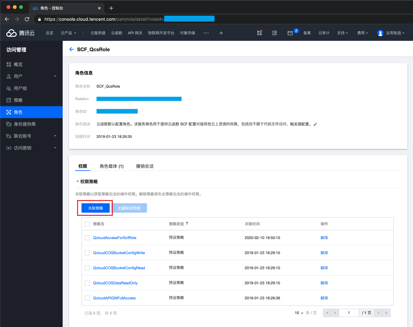 在访问管理https://console.cloud.tencent.com/cam/role,的角色中找到SCF_QcsRole,点击关联策略