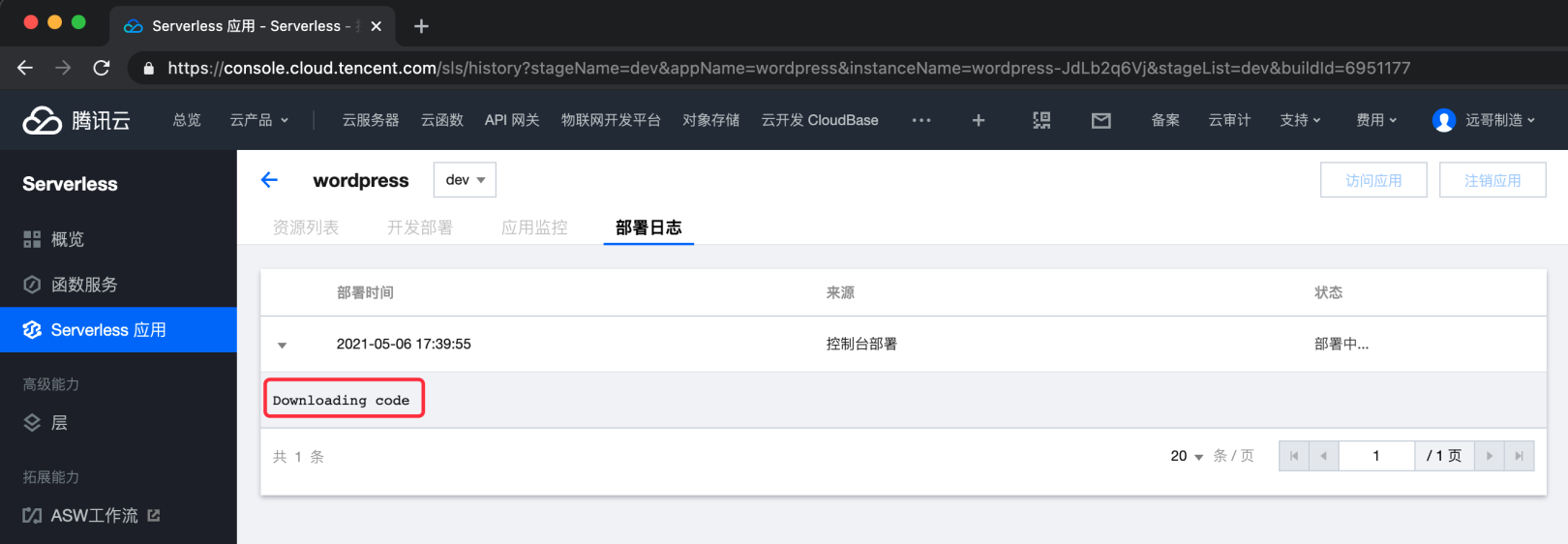 点击完成,开始部署,可以在部署日志中看到进度,这里需要稍等一段时间(自己部署时卡在Downloading code一段时间……