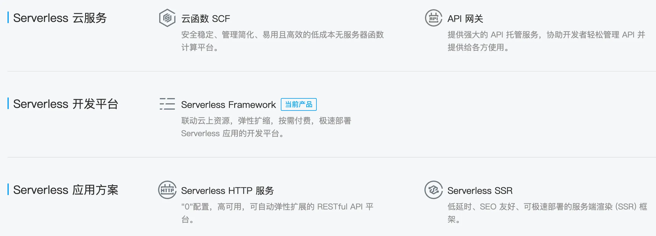 Serverless通常翻译为「无服务架构」,是一种软件系统设计架构思想和方法,并不是一个开发框架或者工具。它的出现是为了让开发者更加关注业务的开发,而将繁杂的运维和部署交给云厂商。Serverless由Faas和Baas组成,Faas为开发者提供业务运算环境,然后与Baas提供的数据和存储服务,进行交互,从而提供与传统服务一致的体验。但是由于Faas是无状态的,并且其运行环境是有读写限制的,最重要的是它是基于事件触发的。因此如果传统Web服务想迁移到Serverless上,是需要进行相关改造和特殊处理的,为此迁移成本是必不可少的!腾讯云 Serverless 产品家族