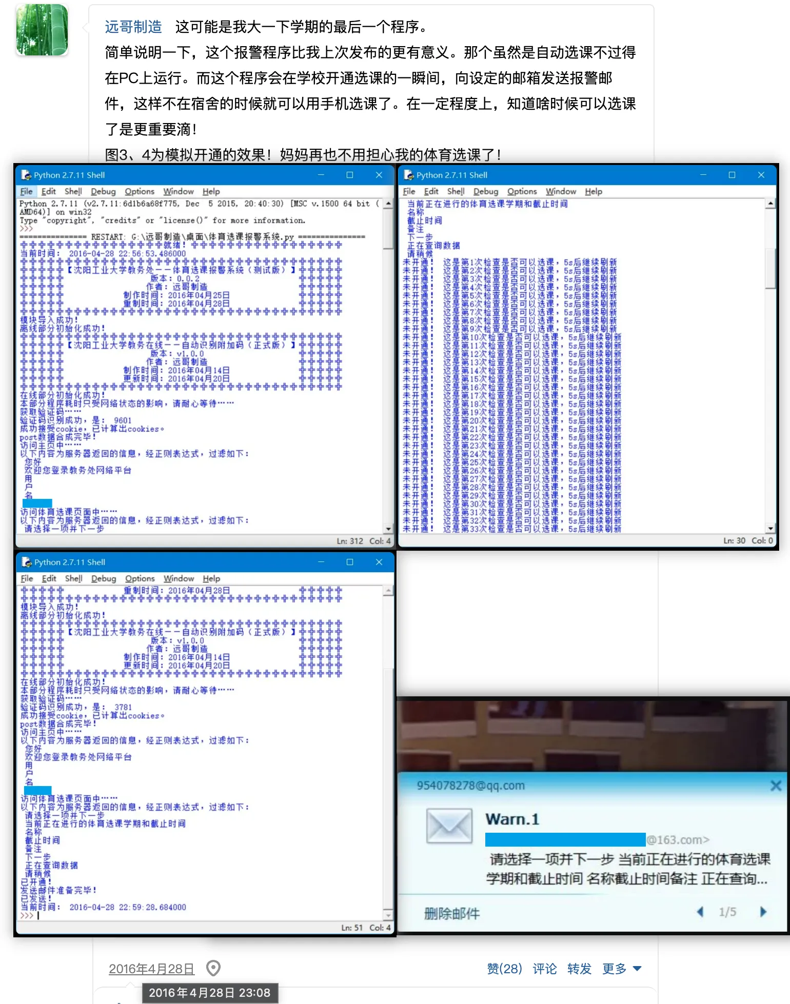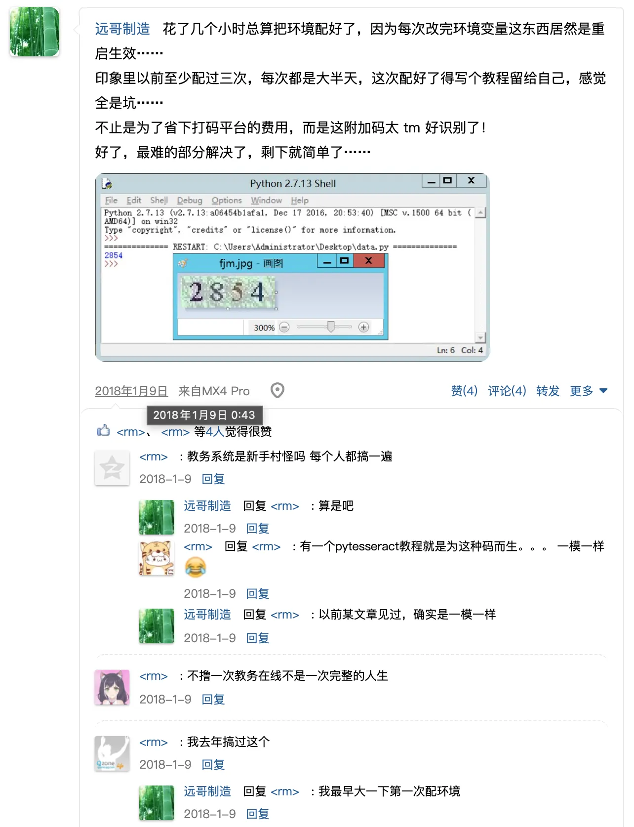 然后等到专业课讲C语言的时候,觉得这门语言对于自己来说过于不便,业余时间就已经在看py了,还记得第一个抄的是识别jwzx(教务在线)的附加码(指验证码)的爬虫脚本